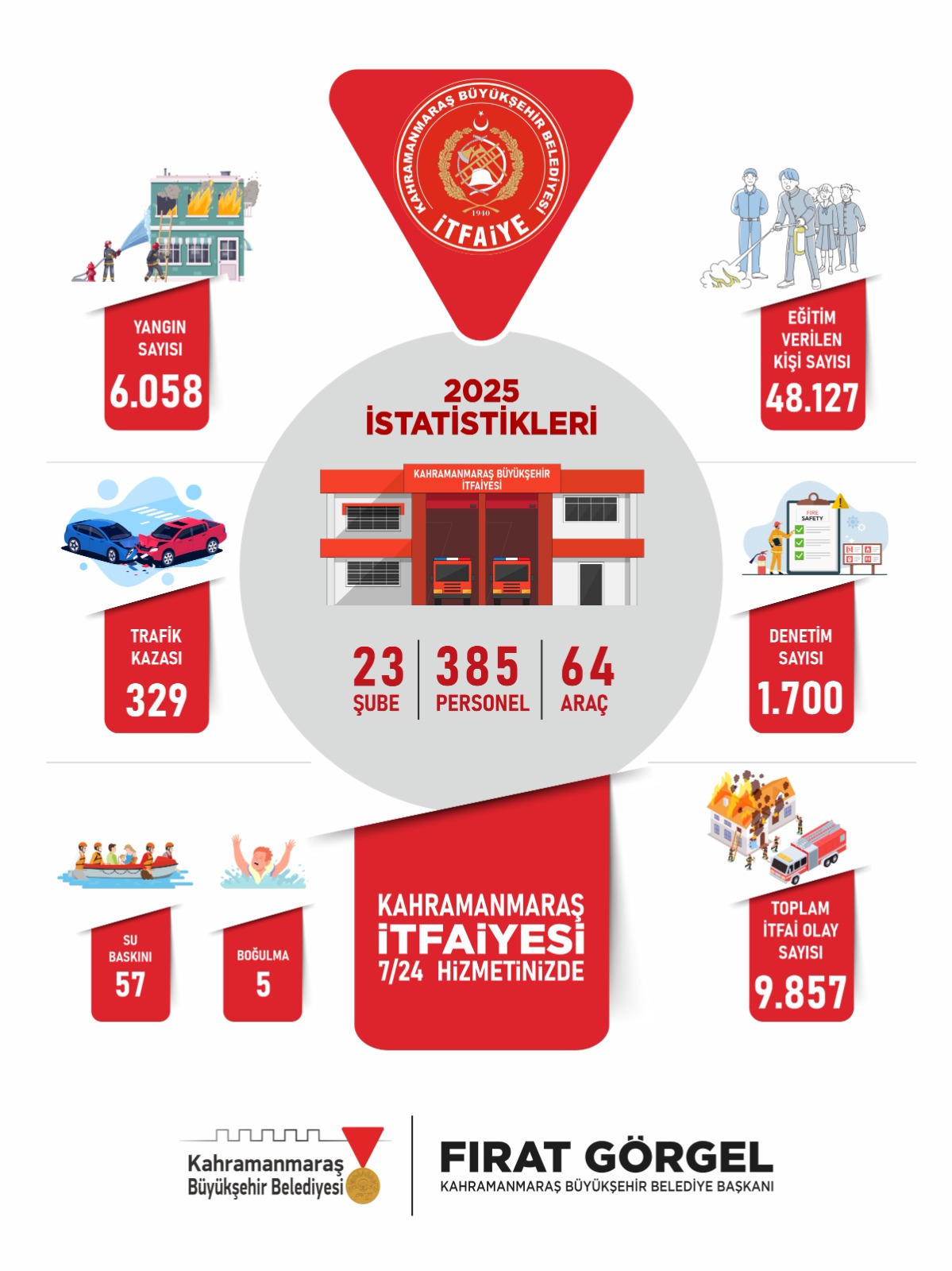 23 şube, 385 deneyimli personel ve 64 araçla yıl boyunca sahada aktif görev alan İtfaiye ve Afet İşleri Dairesi Başkanlığı, 2025 yılında; 6 bin 58 yangın, 329 trafik kazası, 57 su baskını, 5 boğulma ve 9 bin 857 itfai olay olmak üzere toplam 16 bin 306 olaya müdahale etti.