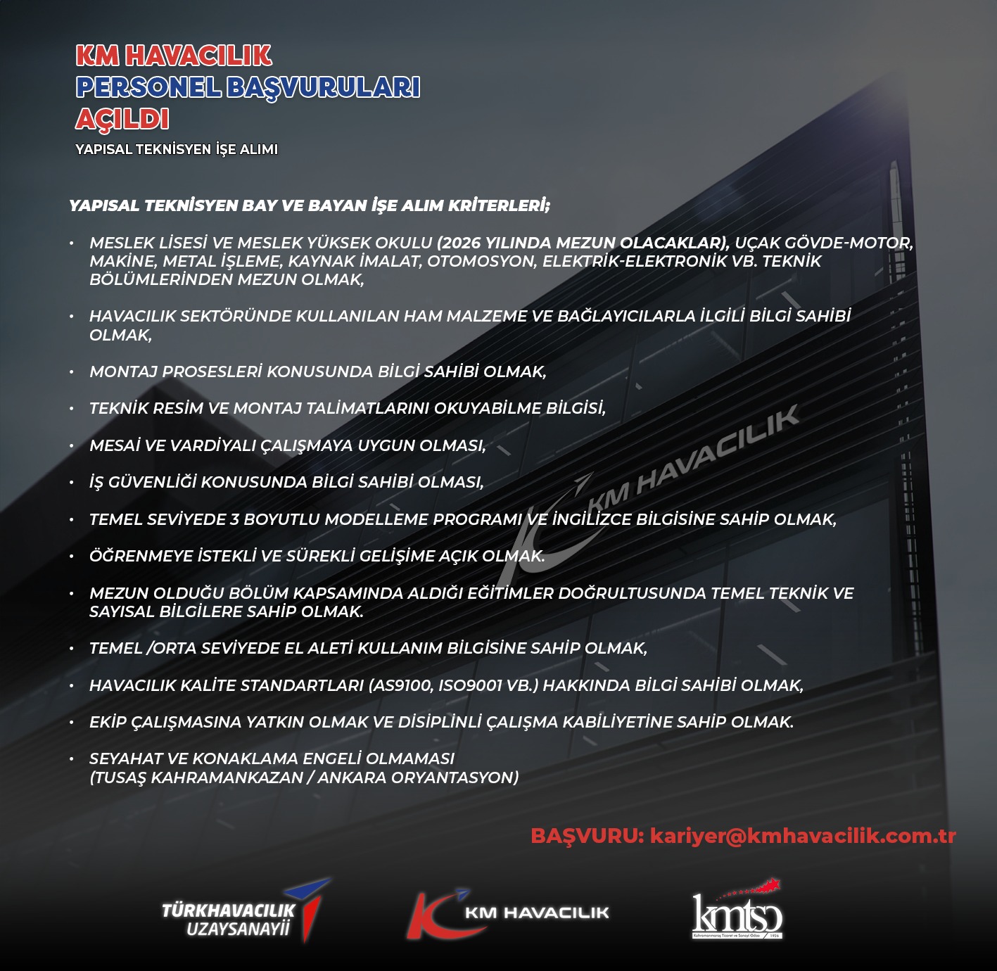 *Meslek Lisesi veya Meslek Yüksek Okulu (2026 yılı mezunları da dahil) Uçak Gövde-Motor, Makine, Metal İşleme, Kaynak, Otomasyon, Elektrik-Elektronik gibi teknik bölümlerden mezun olması,