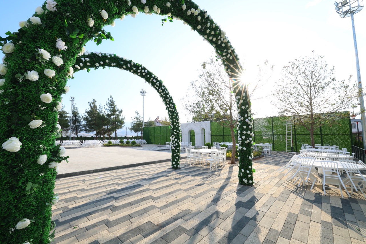 Salonun çevresinde yer alan fotoğraf çekim alanları, yürüyüş yolları, süs havuzları ve otopark düzenlemeleri, misafirlere huzurlu ve konforlu bir deneyim sunacak şekilde planlandı. Özellikle doğanın içinde, açık havada düğün yapmak isteyen çiftler için ideal bir ortam oluşturuldu. Geniş sahne ve dans alanı, güçlü ses sistemi ve modern aydınlatma teknolojileriyle desteklenen tesis, her detayıyla unutulmaz organizasyonlara ev sahipliği yapacak.