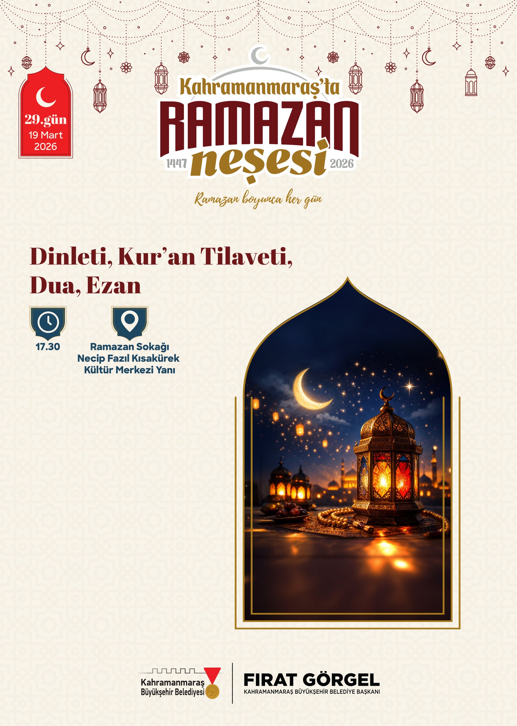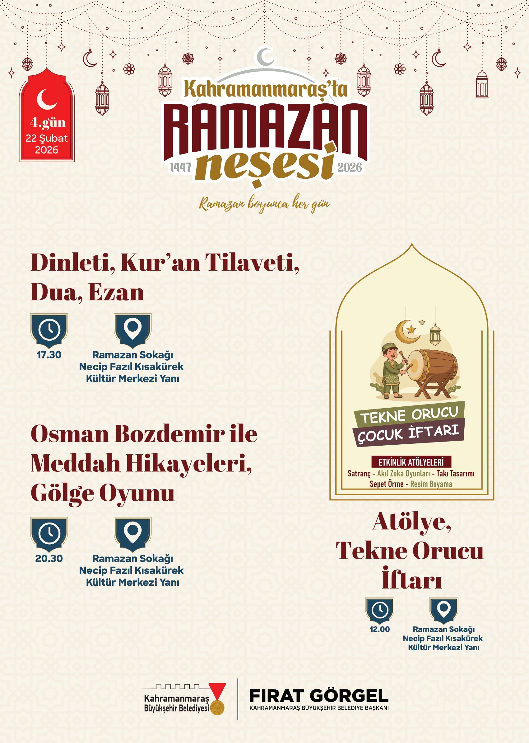Ramazan ayının manevi iklimini şehir genelinde hissettirmek ve her yaştan vatandaşı kültür ile sanatla buluşturmak amacıyla Kahramanmaraş Büyükşehir Belediyesi, dolu dolu bir etkinlik takvimi hazırladı. Ay boyunca çocuklardan yetişkinlere kadar geniş bir kesime hitap edecek programlarla Ramazan’ın huzuru; tiyatrodan söyleşiye, ilahi dinletilerinden atölye çalışmalarına kadar birçok başlık altında yaşatılacak. Etkinliklerin merkezi, Necip Fazıl Kısakürek Kültür Merkezi yanında oluşturulan Ramazan Sokağı olacak. Ramazan ayı boyunca her gün vatandaşların buluşma noktası haline gelecek alanda, manevi atmosferi güçlendiren programlar aralıksız devam edecek.
