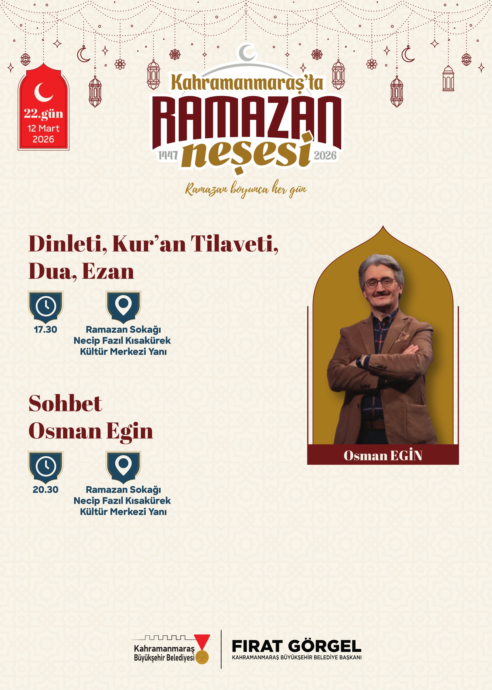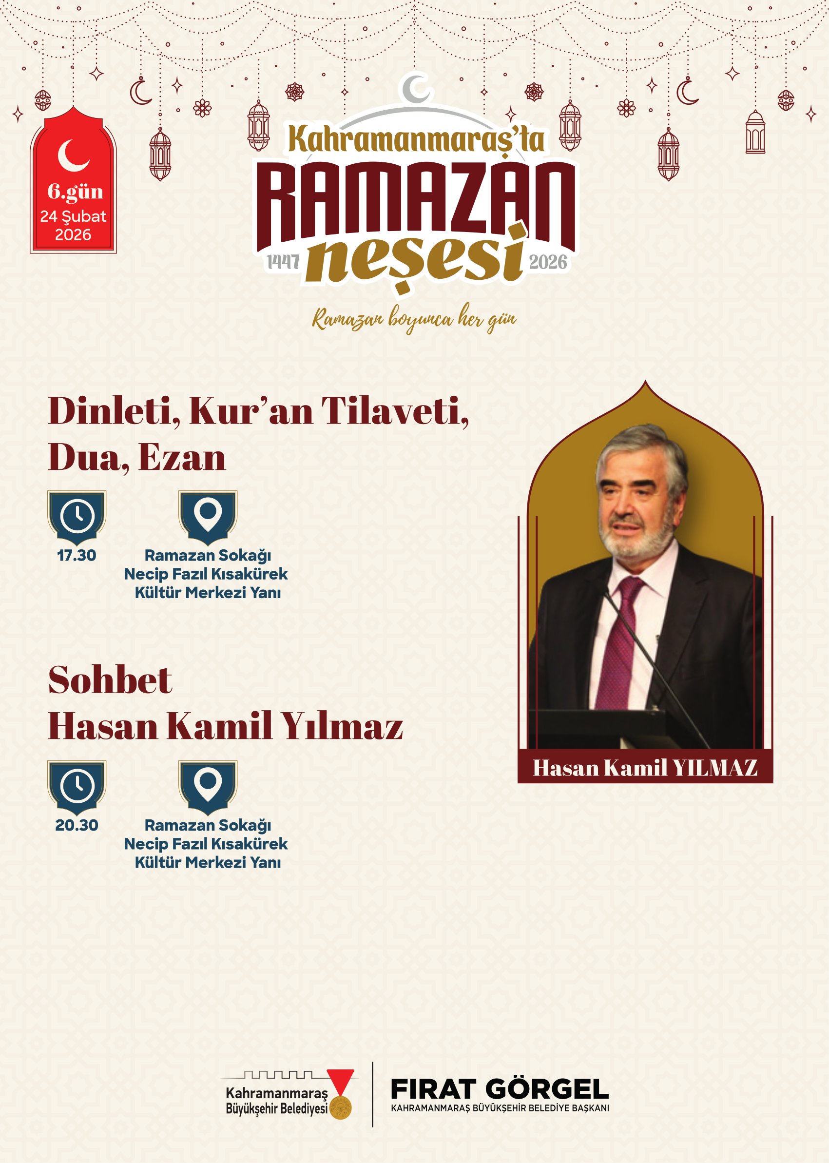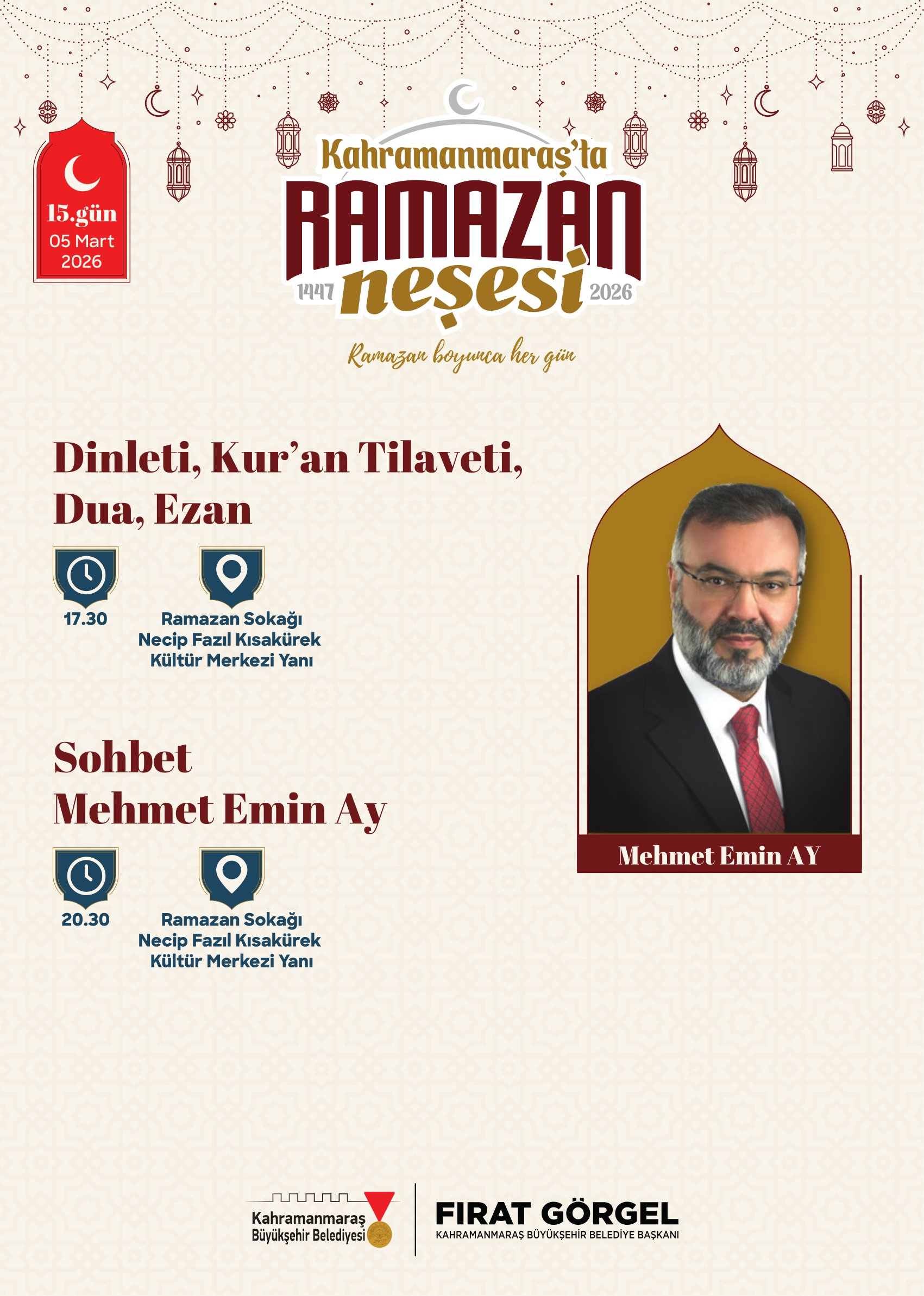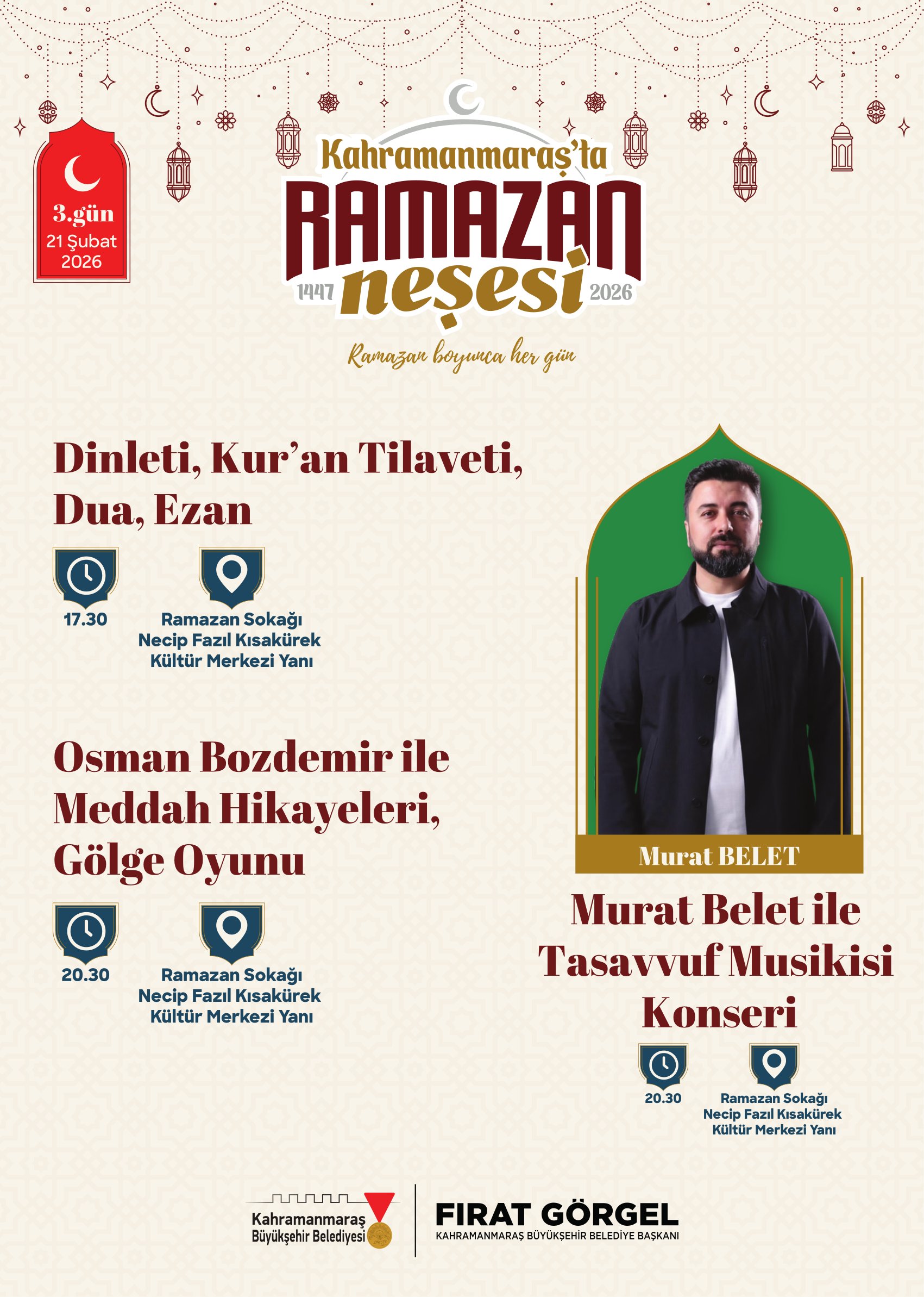 Ramazan etkinlikleri kapsamında birbirinden değerli isimler Ramazan Sokağı’nda Kahramanmaraşlılarla buluşacak. 21 Şubat Cumartesi günü tasavvuf musikisinin sevilen ismi Mustafa Belet sahne alacak. 24 Şubat Salı günü ilahiyatçı ve akademisyen Hasan Kâmil Yılmaz, Ramazan’ın manevi boyutunu ele alan sohbet programıyla vatandaşlarla buluşacak. 26 Şubat Perşembe günü yazar Yasin Pişgin söyleşisiyle gönüllere dokunacak. 1 Mart Pazar günü sanatçı Mustafa Cihat, tasavvuf musiki konseriyle Ramazan gecesine anlam katacak. 3 Mart Salı günü akademisyen yazar Ömer Demirbağ, sohbet programıyla katılımcılarla bir araya gelecek. 5 Mart Perşembe günü ilahiyatçı Mehmet Emin Ay, Ramazan’ın manevi derinliğine dair konuşmasıyla programa konuk olacak. 7 Mart Cumartesi günü müzisyen Agah Terzi, tasavvuf musiki dinletisiyle sahne alacak. 8 Mart Pazar günü psikolog yazar Hatice Kübra Tongar aile, çocuk ve maneviyat temalı sohbetiyle vatandaşlarla buluşacak. 12 Mart Perşembe günü yazar Osman Egin, söyleşi programıyla Ramazan akşamına renk katacak. 17 Mart Salı günü ise şair ve akademisyen Nurullah Genç, sohbet programıyla Ramazan Sokağı’nın konuğu olacak.