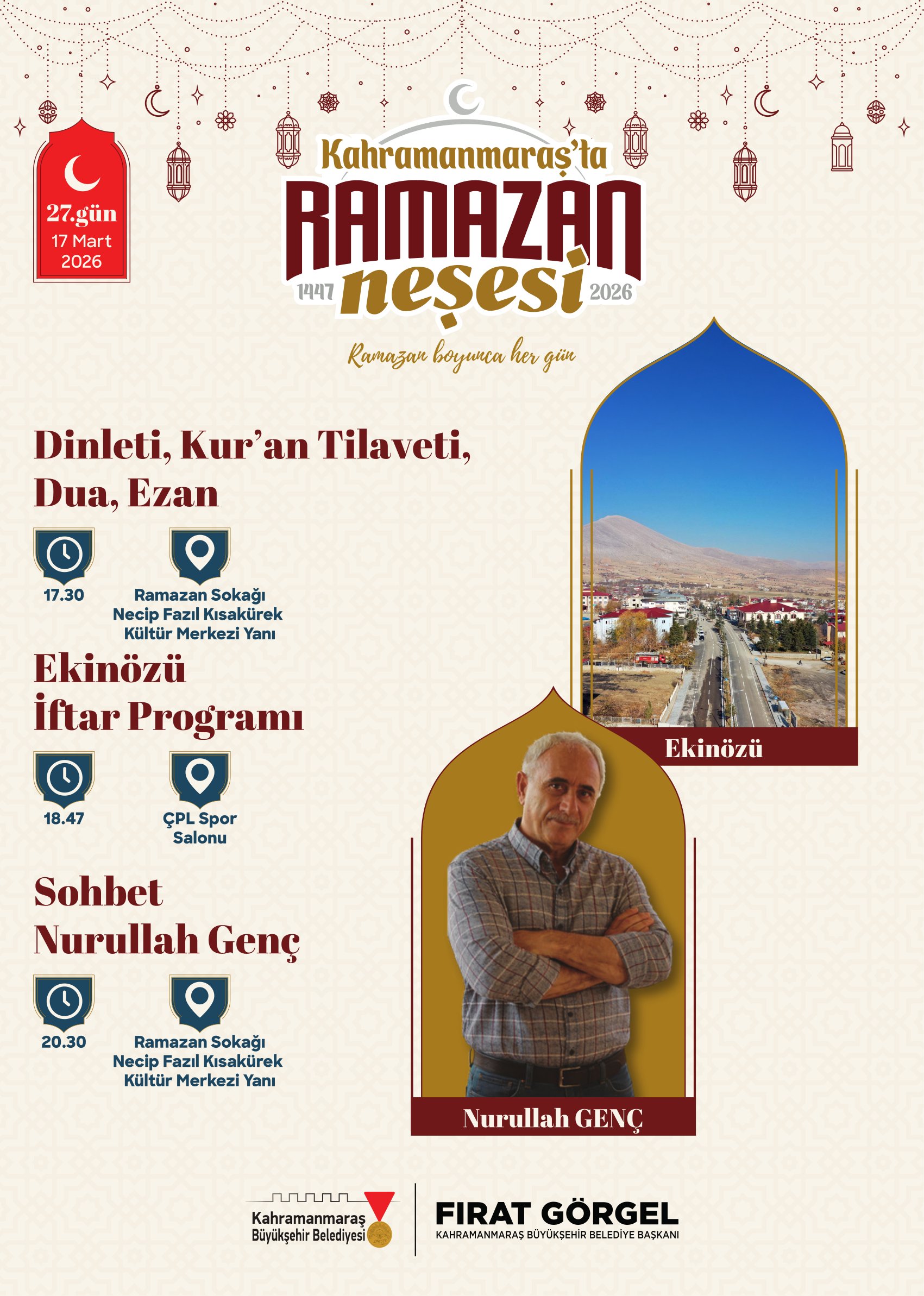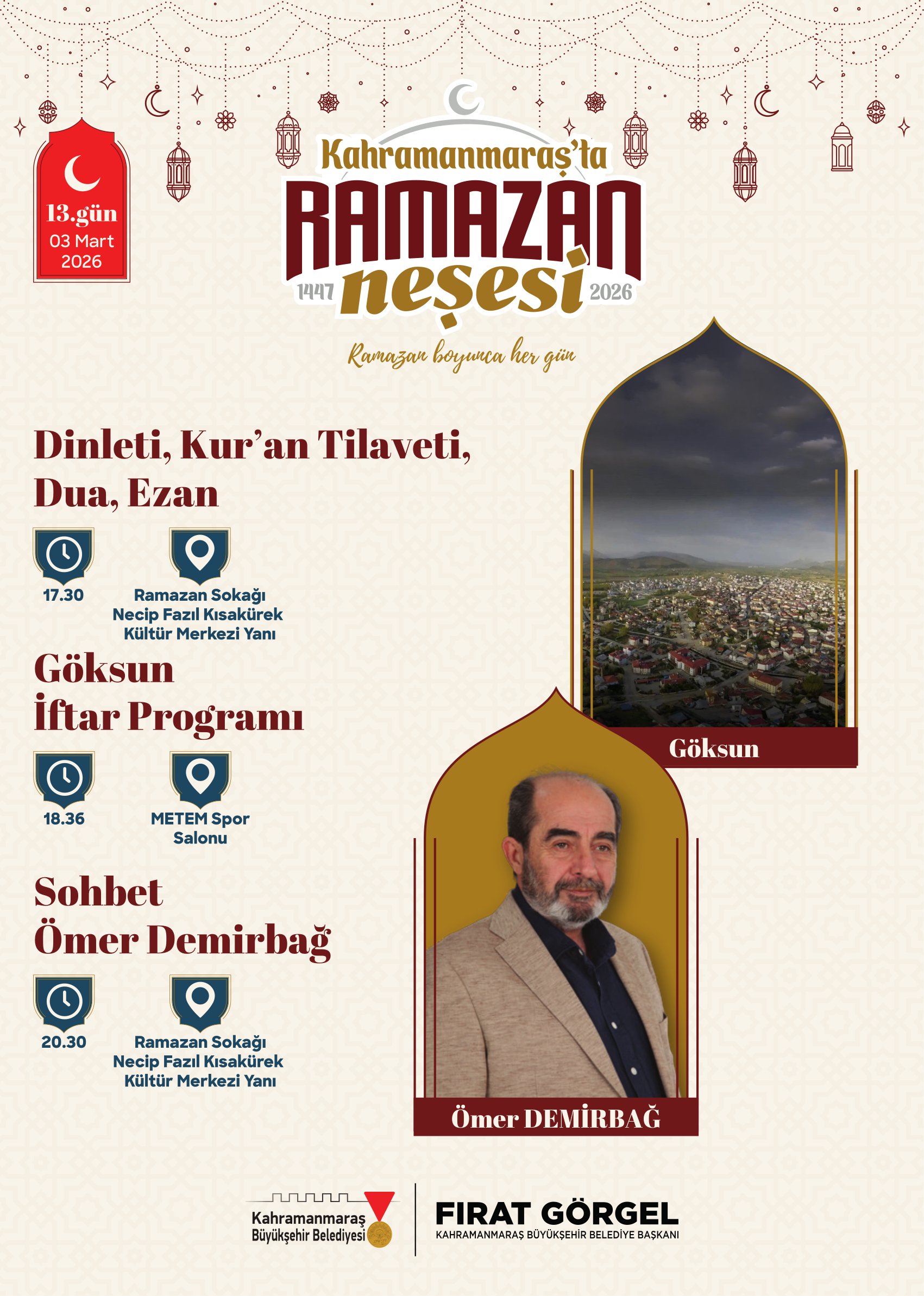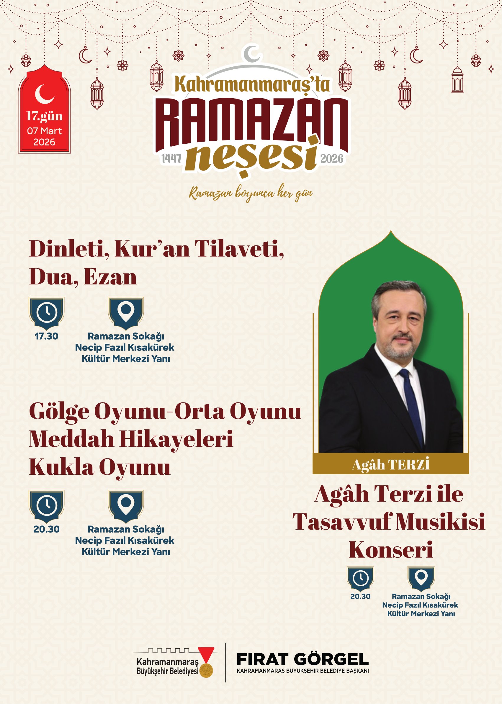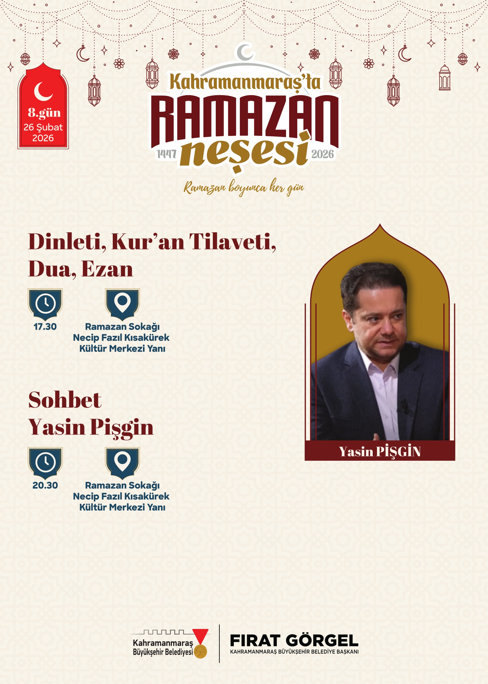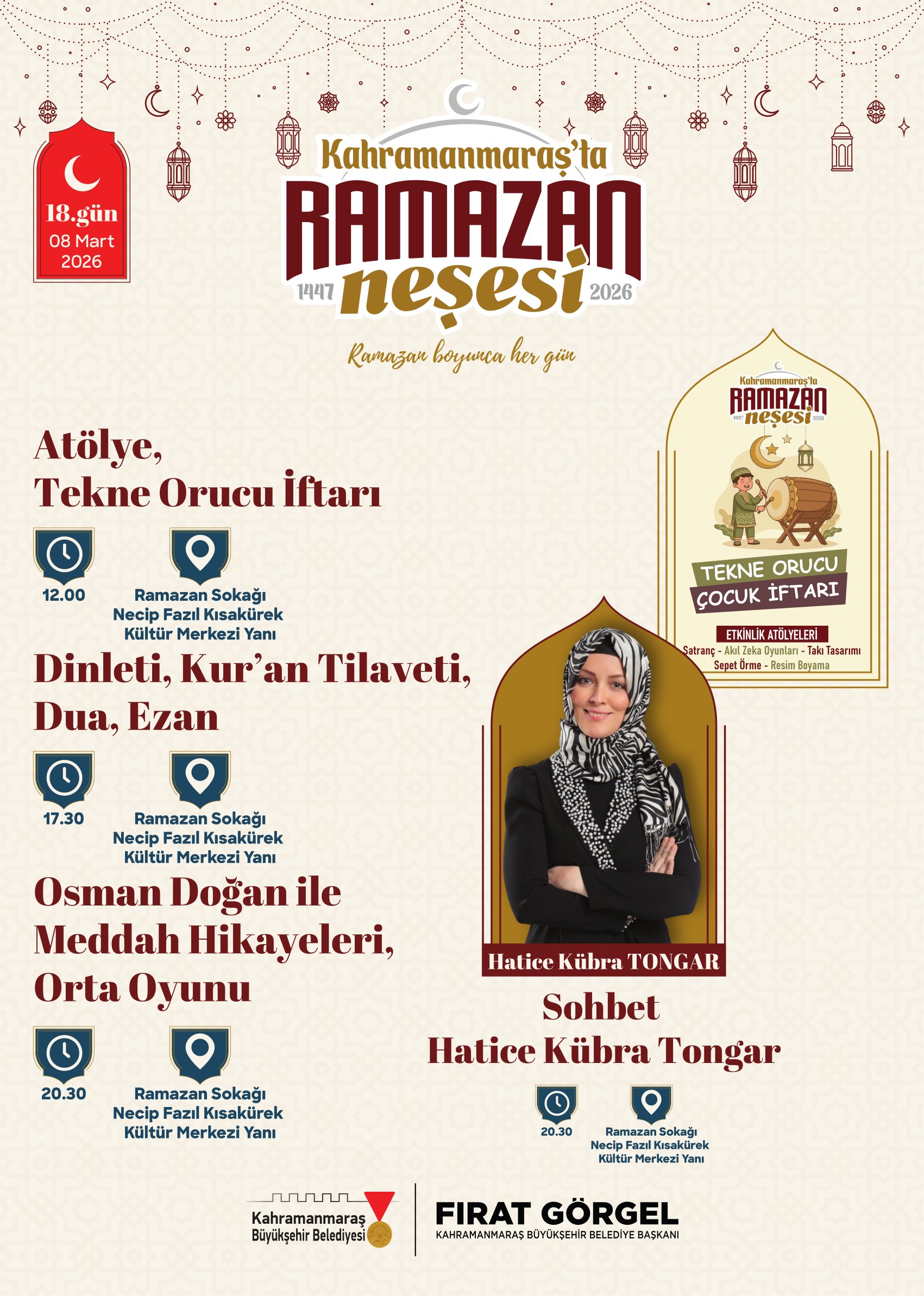 Ramazan etkinlikleri kapsamında birbirinden değerli isimler Ramazan Sokağı’nda Kahramanmaraşlılarla buluşacak. 21 Şubat Cumartesi günü tasavvuf musikisinin sevilen ismi Mustafa Belet sahne alacak. 24 Şubat Salı günü ilahiyatçı ve akademisyen Hasan Kâmil Yılmaz, Ramazan’ın manevi boyutunu ele alan sohbet programıyla vatandaşlarla buluşacak. 26 Şubat Perşembe günü yazar Yasin Pişgin söyleşisiyle gönüllere dokunacak. 1 Mart Pazar günü sanatçı Mustafa Cihat, tasavvuf musiki konseriyle Ramazan gecesine anlam katacak. 3 Mart Salı günü akademisyen yazar Ömer Demirbağ, sohbet programıyla katılımcılarla bir araya gelecek. 5 Mart Perşembe günü ilahiyatçı Mehmet Emin Ay, Ramazan’ın manevi derinliğine dair konuşmasıyla programa konuk olacak. 7 Mart Cumartesi günü müzisyen Agah Terzi, tasavvuf musiki dinletisiyle sahne alacak. 8 Mart Pazar günü psikolog yazar Hatice Kübra Tongar aile, çocuk ve maneviyat temalı sohbetiyle vatandaşlarla buluşacak. 12 Mart Perşembe günü yazar Osman Egin, söyleşi programıyla Ramazan akşamına renk katacak. 17 Mart Salı günü ise şair ve akademisyen Nurullah Genç, sohbet programıyla Ramazan Sokağı’nın konuğu olacak.