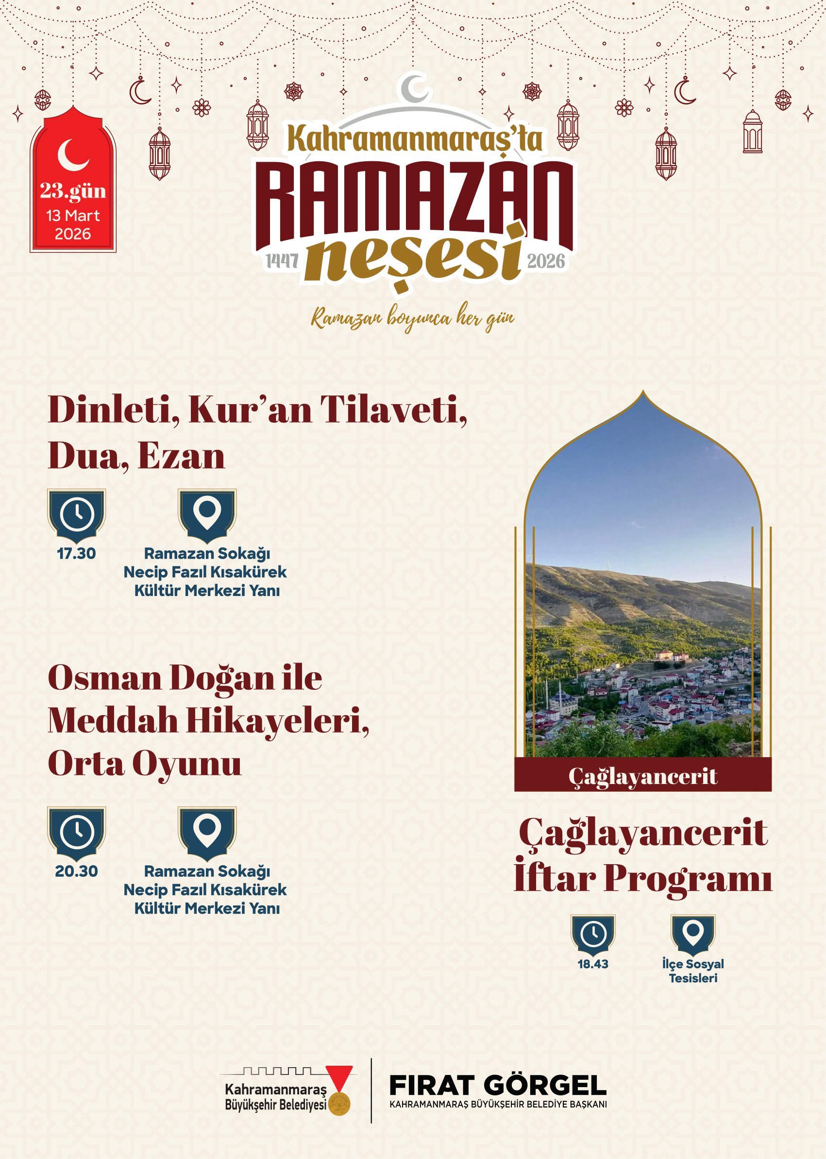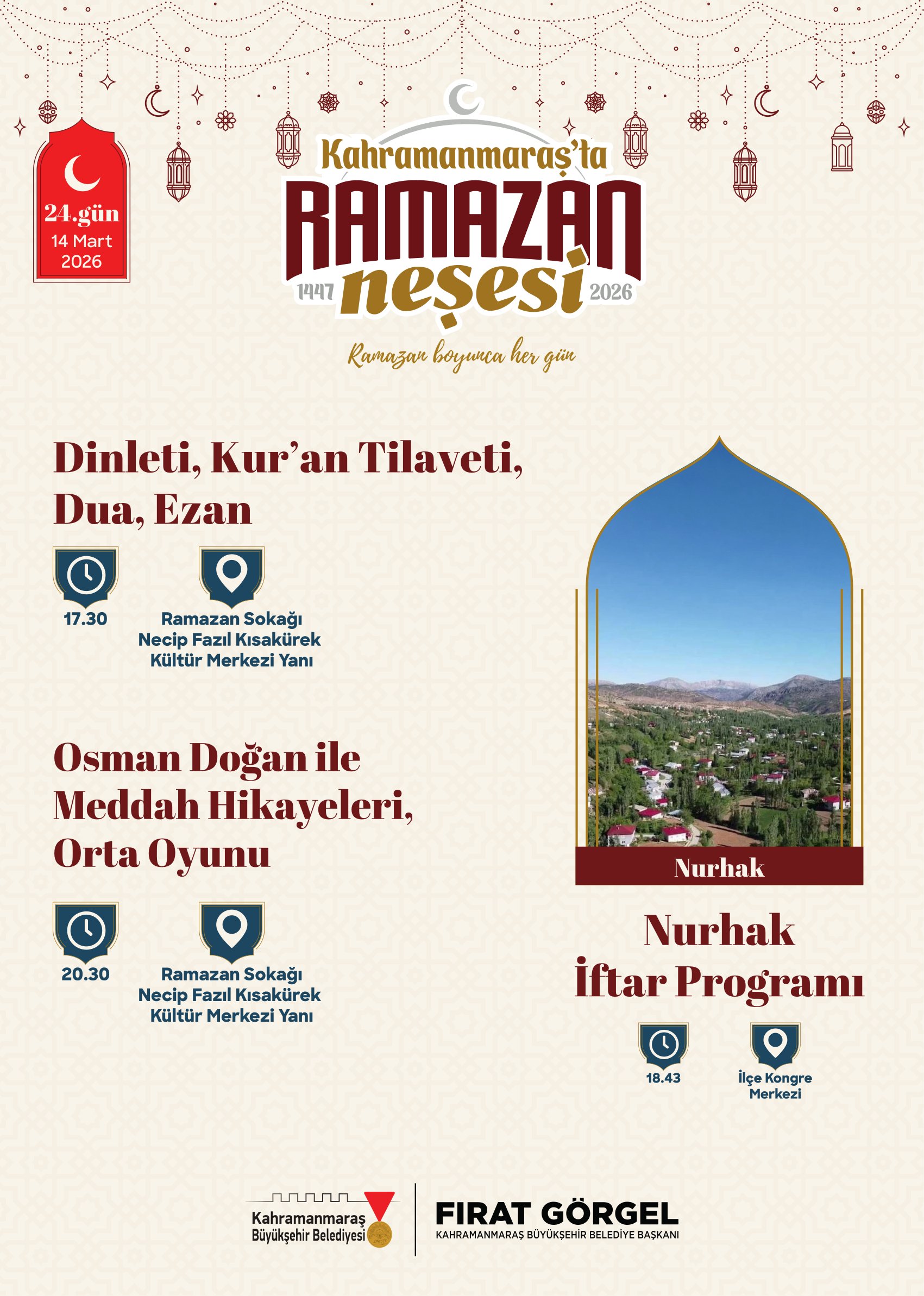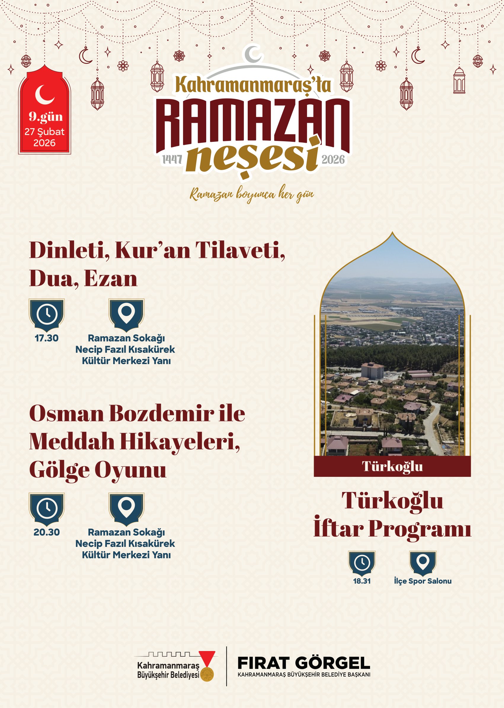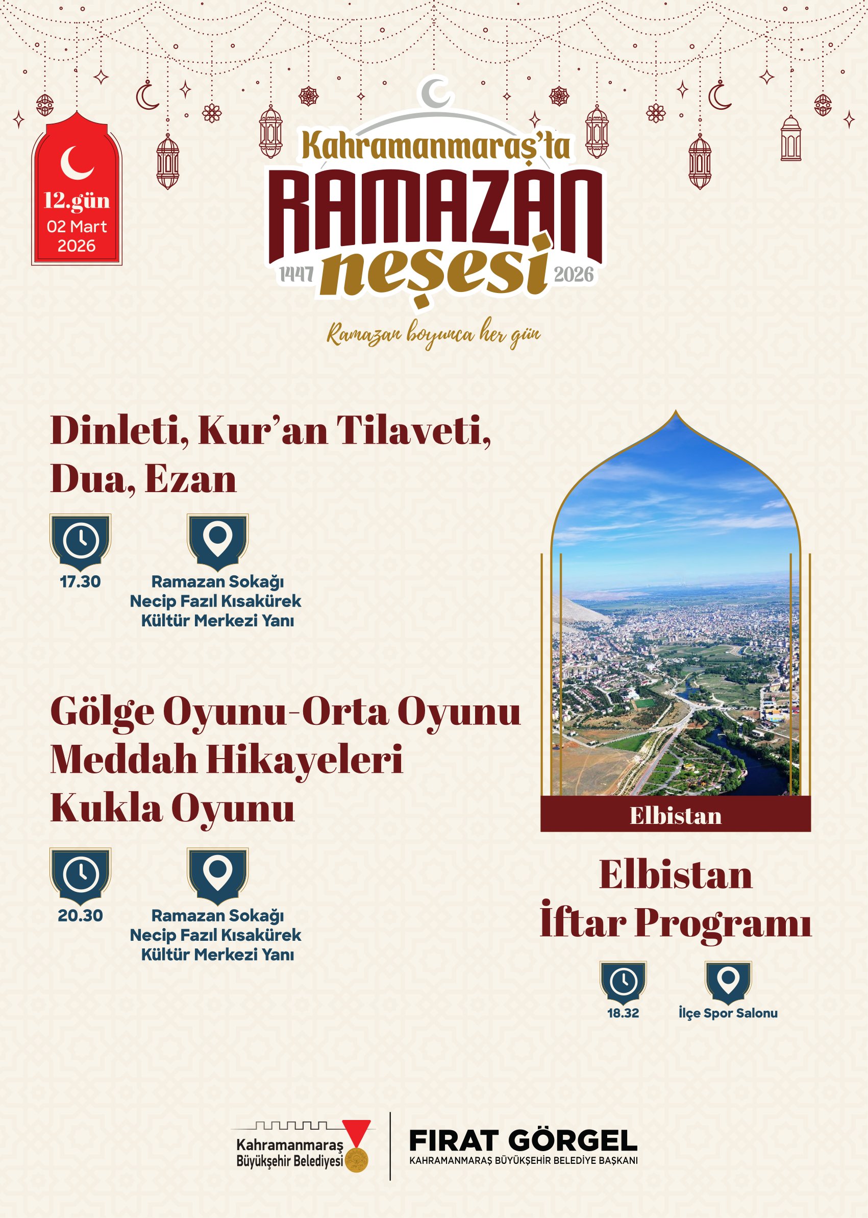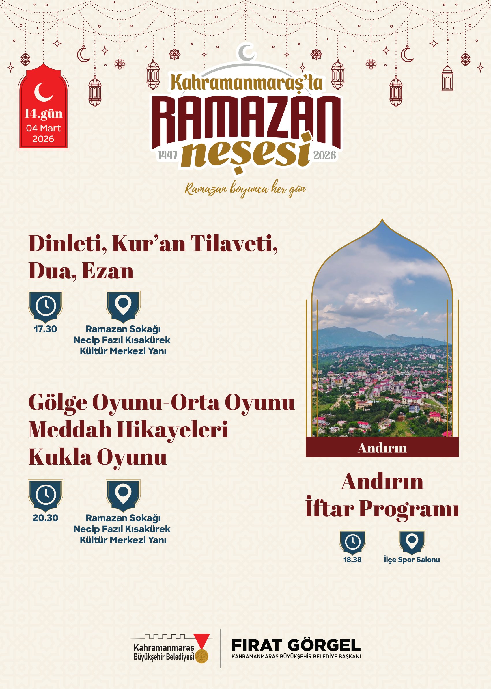 Büyükşehir Belediyesi tarafından yapılan açıklamada, Ramazan ayı boyunca gerçekleştirilecek tüm etkinliklerin ücretsiz olduğu ve vatandaşların programlara davetli olduğu ifade edildi. Etkinlik takvimine https://kahramanmaras.bel.tr/duyuru/2026/02/17/ramazan-ayi-etkinlik-takvimi internet adresi üzerinden ulaşılabileceği belirtilirken, Ramazan Sokağı’nın bu yıl şehrin manevi buluşma noktası olması hedefleniyor. Sanat, kültür ve maneviyatın iç içe geçtiği Ramazan programlarıyla Kahramanmaraş’ta Ramazan akşamlarının dolu dolu geçmesi planlanıyor.