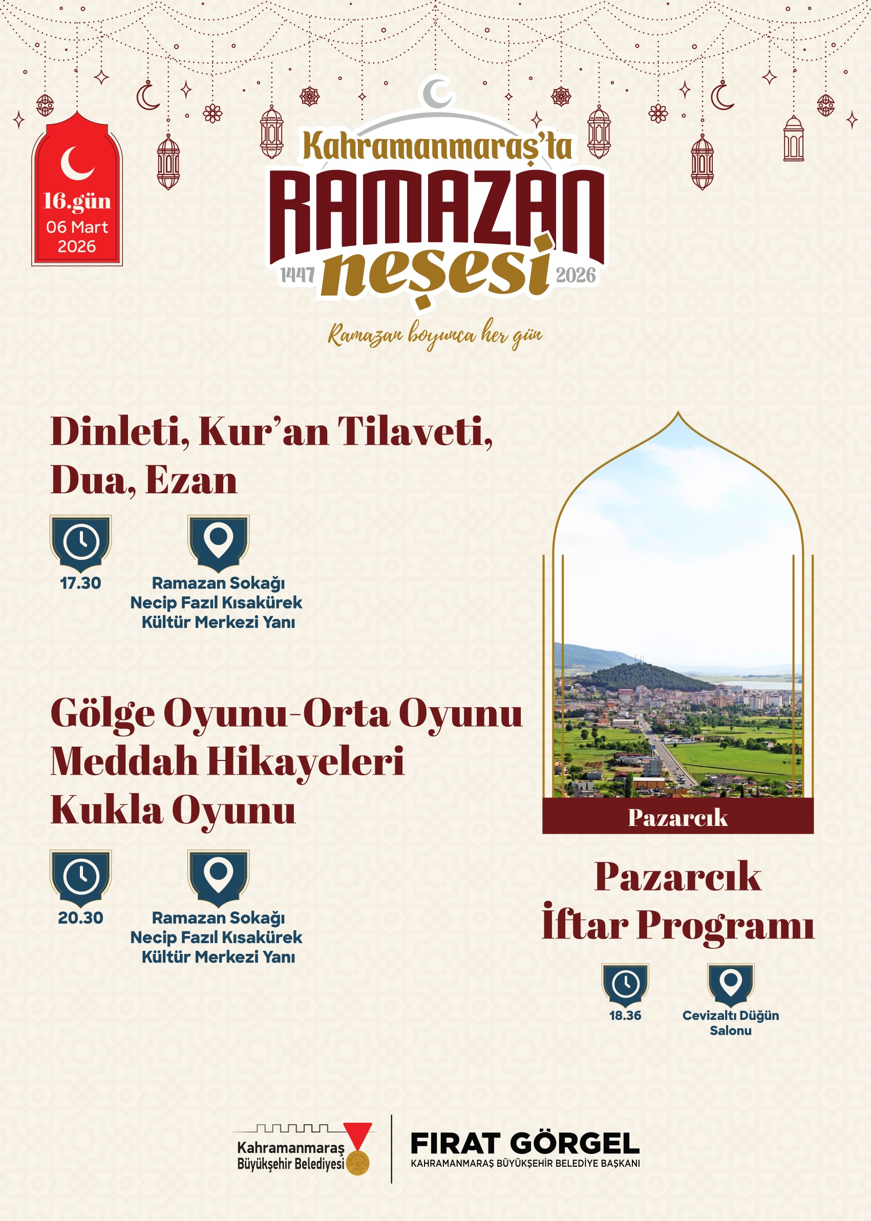 Büyükşehir Belediyesi tarafından yapılan açıklamada, Ramazan ayı boyunca gerçekleştirilecek tüm etkinliklerin ücretsiz olduğu ve vatandaşların programlara davetli olduğu ifade edildi. Etkinlik takvimine https://kahramanmaras.bel.tr/duyuru/2026/02/17/ramazan-ayi-etkinlik-takvimi internet adresi üzerinden ulaşılabileceği belirtilirken, Ramazan Sokağı’nın bu yıl şehrin manevi buluşma noktası olması hedefleniyor. Sanat, kültür ve maneviyatın iç içe geçtiği Ramazan programlarıyla Kahramanmaraş’ta Ramazan akşamlarının dolu dolu geçmesi planlanıyor.